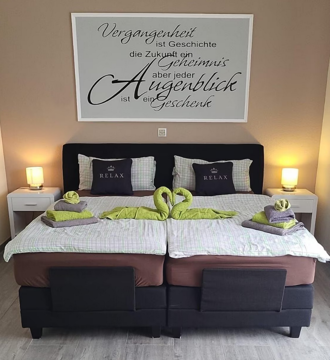 Die liebevoll eingerichtete Ferienwohnung liegt im Obergeschoss einer Stadtvilla in einem ruhigen Neubaugebiet. Sie bietet mit 92 qm (2 Schlafzimmer, Küche, Bad, Wellnessraum, Wohnzimmer und Flur) genügend Platz für 1 - 4 Personen und lädt zu einem erholsamen Familienurlaub ein. Die Küche ist mit modernen Geräten, genügend Geschirr und Geschirrhandtüchern komplett eingerichtet. Damit Sie sich schnell in der Ferienwohnung und der Umgebung zurecht finden, liegt eine kleine Info-Mappe für Sie bereit. Das großzügige Schlafzimmer ist mit einem großen Boxspringbett, welches elektrisch verstellbar ist, und Matratzen mit zwei verschiedenen Härtegraden (H2 und H3) ausgestattet. Der große Wintergarten mit elektrischer Beschattung lädt - mit dem wunderschönen Ausblick auf den Kanal , den Gartenmöbeln und dem Gasgrill - zum gemütlichen Verweilen ein.