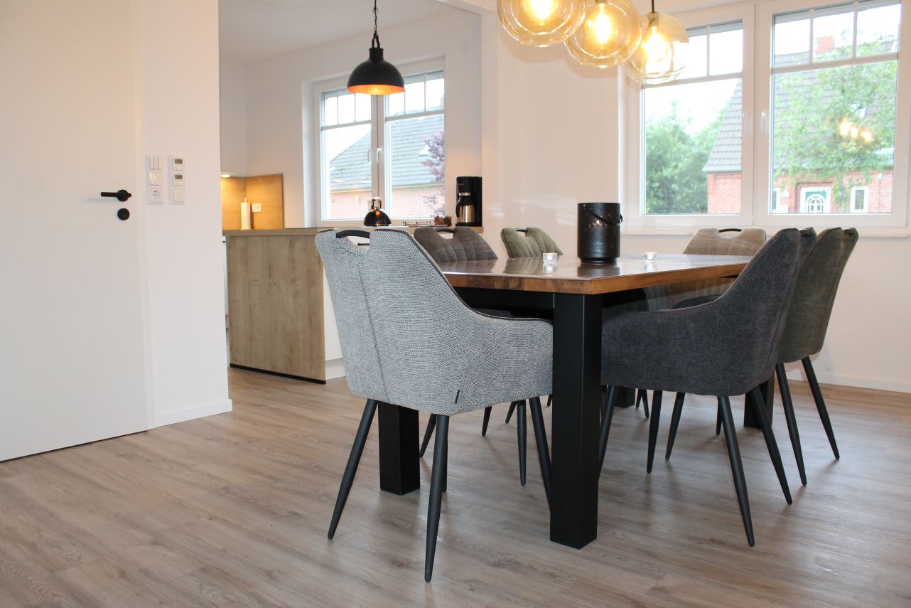 Die helle Küche und das großzügige Wohnzimmer mit gemütlichem Sofa haben einen direkten Zugang auf die Süd-Terrasse mit Gartenblick. Hier lässt es sich entspannt die warme Sonne genießen. Hier, dirket um die Ecke von Greetsiel, finden Sie alles, was Sie in Ostfriesland für einen erholsamen Urlaub brauchen: Tolle Ferienwohnung, Ruhe, frische Landluft und das Meer, machen den Urlaub perfekt!
