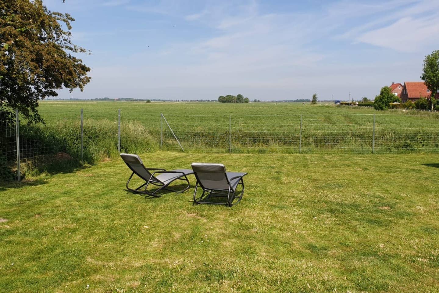 Der Garten hat einen Zaun. Hier können Urlauber nicht weit vom Deich einen unverbaubaren Blick in in die Weite Ostfrieslands werfen, während ihr Vierbeiner sich mit ausreichend Bewegung im Freien austoben kann.